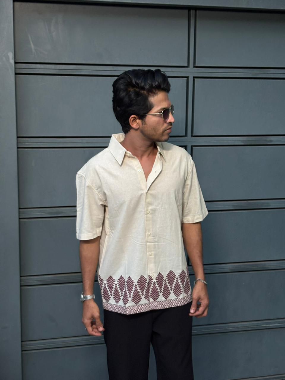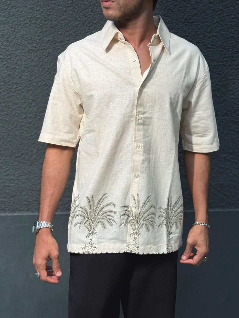 Elevate your casual style with this embroidered beige shirt, crafted from soft, breathable fabric for all-day comfort. The shirt features elegant palm tree embroidery along the hemline, adding a touch of tropical charm to its minimal design. With a relaxed regular fit, short sleeves, and a button-down front, it perfectly balances comfort and sophistication. Ideal for vacations, casual outings, or resort wear.